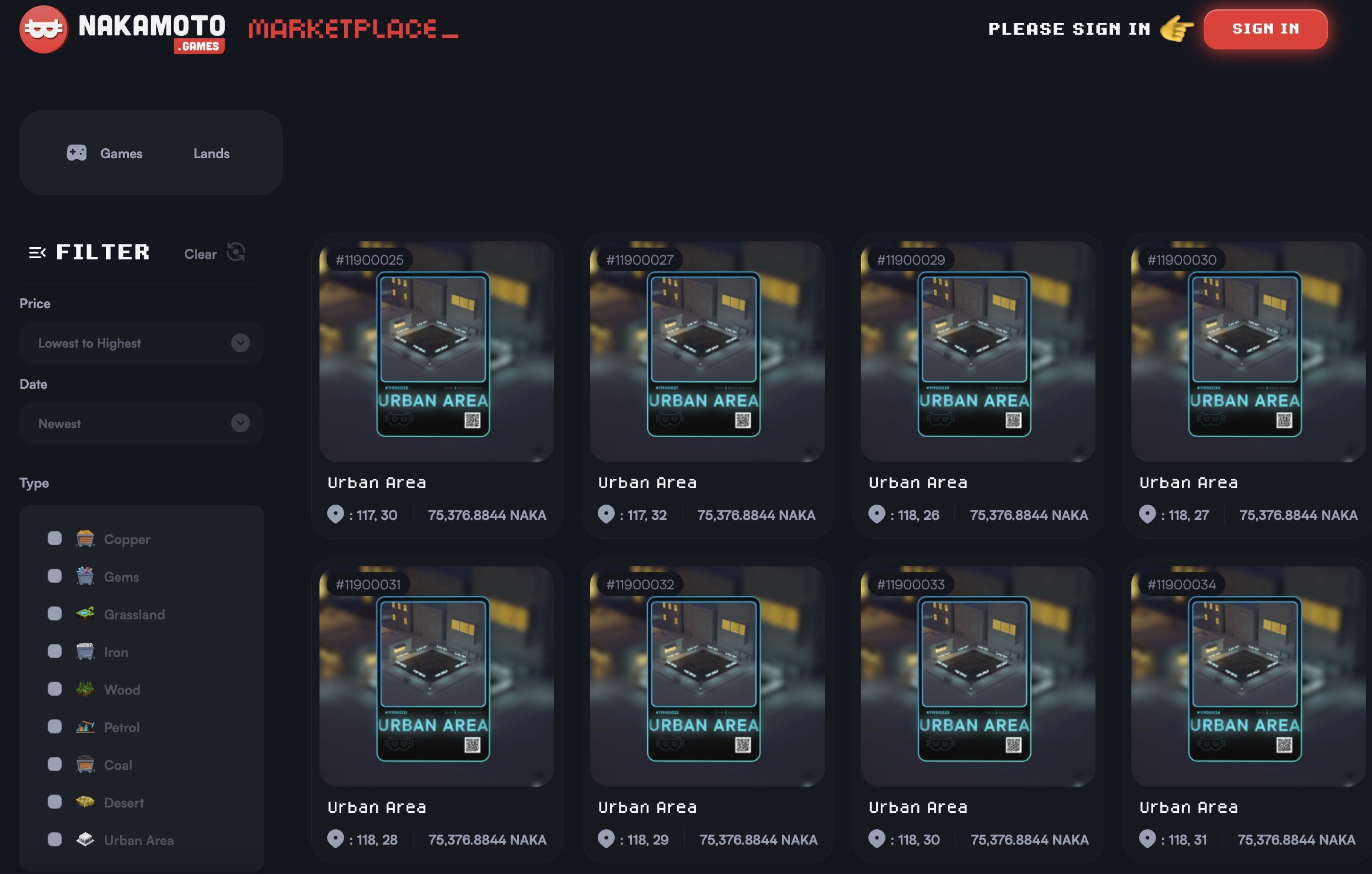 When picking Lands, you'll be met with the Nakaverse land available for sale. You can use the filter on the sidebar to pick the type of land you want to choose. Each lands available will be shown with information depicting as follow: